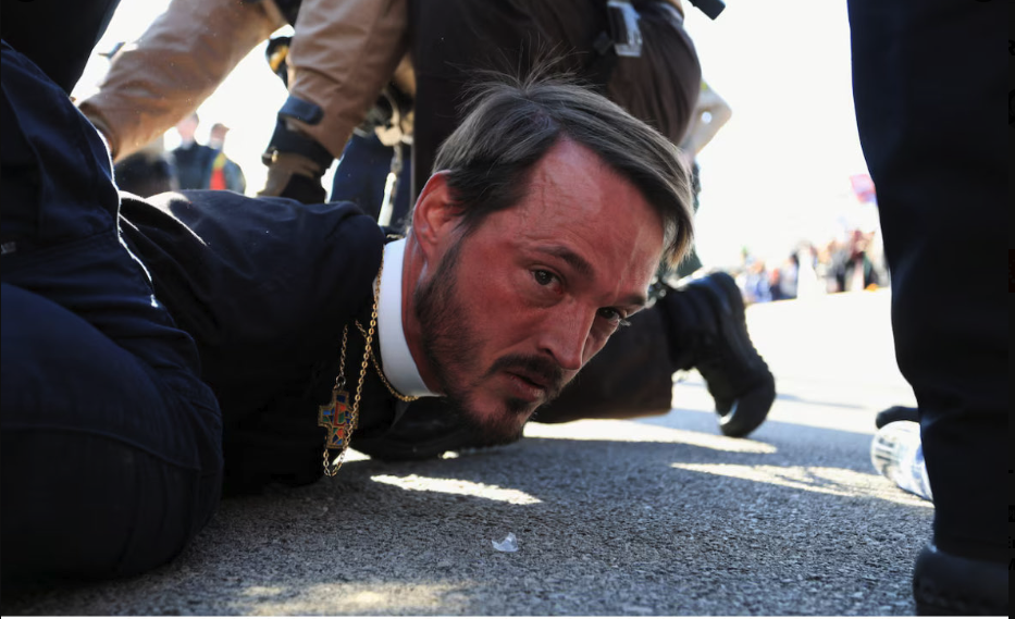 Michael Woolf, minister at Lake Street Church of Evanston, was slammed on the ground and detained by Illinois State Police during a peaceful protest outside the Broadview/ICE facility in Chicago on November 4, 2025. @Reuters